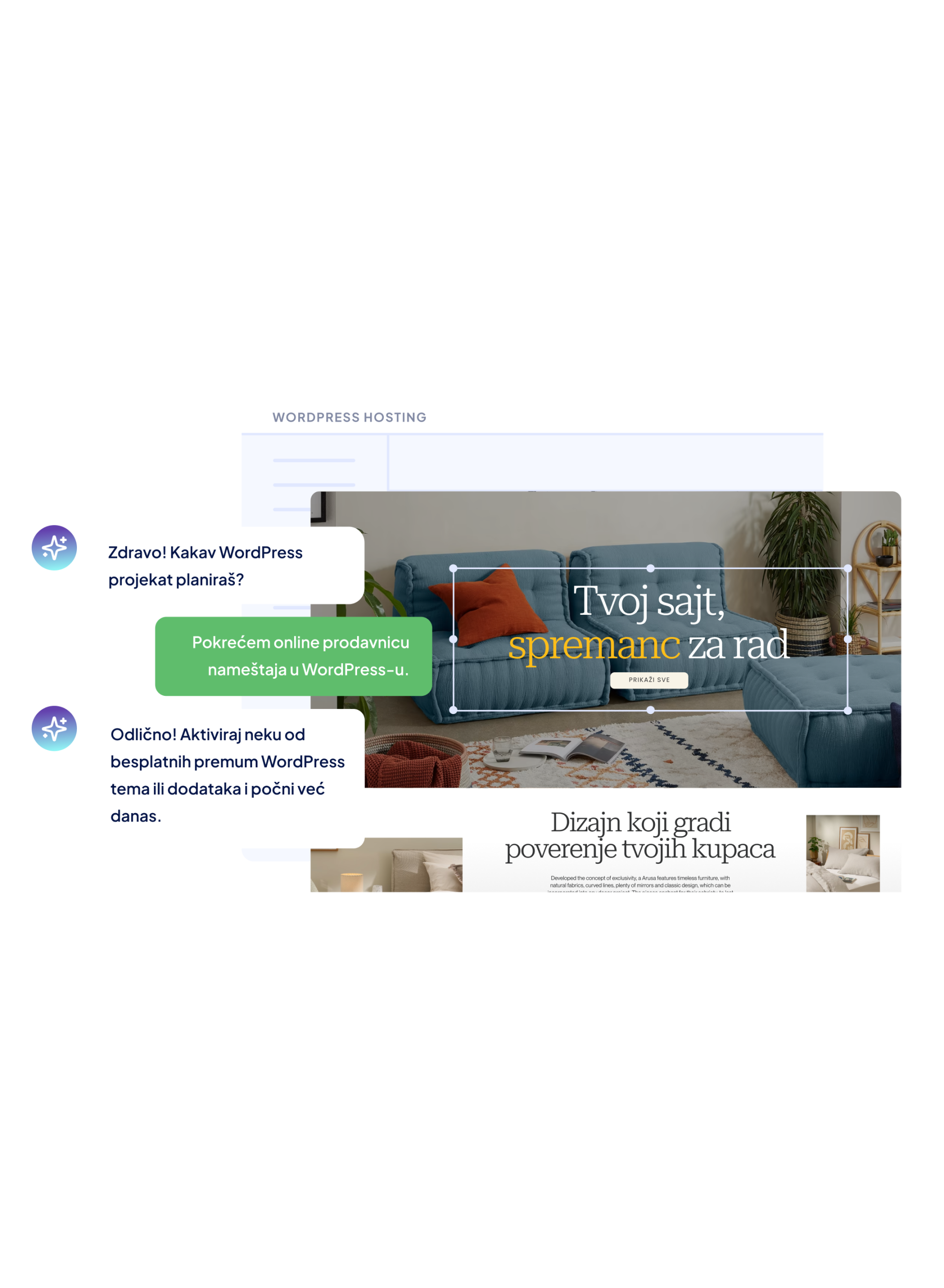 100% optimizovan hosting za WordPress – dizajniran sa ciljem da tvoj WordPress sajt funkcioniše savršeno bilo da kreiraš blog, e-commerce prodavnicu ili prezentacioni sajt.