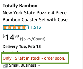 • Obaveštenje o stanju zaliha – Još jedan od načina za izazivanje osećaja hitnosti kod potrošača jeste informisanje o stanju na zalihama. Na taj način korisnicima se suptilno nameće pritisak da kupe proizvod pre nego što bude rasprodat.